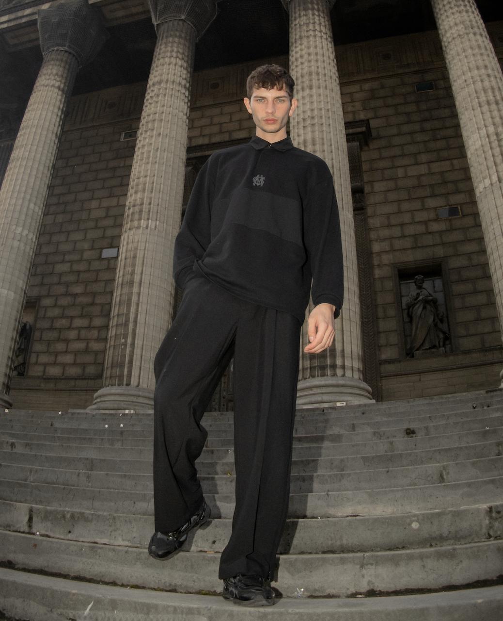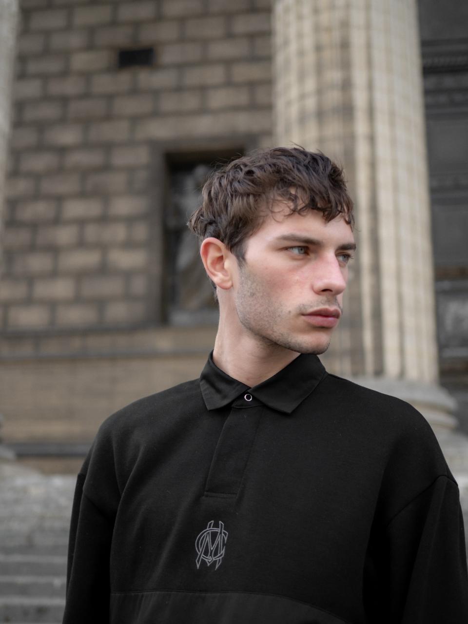 Классический дизайн поло включает в себя центральную часть другого цвета, но в нашем случае мы пересмотрели этот момент и колор блок получился из двух черных цветов.